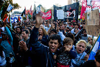 En cuestión de minutos se conforma una serie de rondas donde giran sin pausa los puchos, el mate, la risa. Las banderas se alzan y ondean al viento, la cuestión de fondo trasciende las divisiones de partido. No hay como la camaradería para combatir al frío, no hay como la solidaridad para combatir ese otro frío, ese que no tuvo escrúpulos al momento de dejar en la calle centenares de familias, ese que dispara resuelto sobre los que no tienen nada.