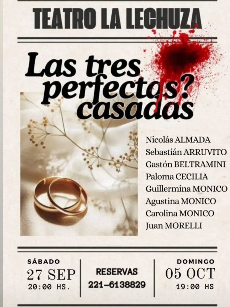 “Las tres perfectas? casadas” se presenta el 5 de octubre en Teatro La Lechuza y el 15 de noviembre en el Centro de Fomento de Gonnet. Un nuevo desafío para un grupo que elige seguir apostando al encuentro vivo del teatro.