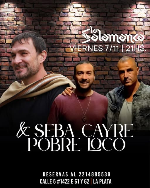 Seba Cayre se presenta este viernes 7 de noviembre, a las 21:30 h en La Salamanca (calle 5 entre 61 y 62 N° 1422, La Plata). Reservas al 221 488 5538. El cantor bonaerense vuelve al escenario platense donde se formó para compartir una noche de música, memoria y reencuentros, acompañado por el dúo Pobre Loco y por los músicos de su primera formación, en un concierto que promete revivir las canciones y el espíritu de aquellos años compartidos en la ciudad.