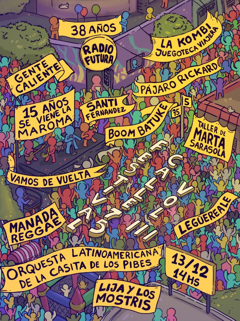 Tocan Santi de Delirio, Pájaro Rickard, Se viene la maroma, Lija y los mostris, Vamos de vuelta, Manada reggae, Legüereaele, la Orquesta Latinoamericana de La casita de los pibes, Boom batuke y Gente Caliente. Además, participan el Taller de Marta Sarasola y La Kombi Juegoteca Viajera.