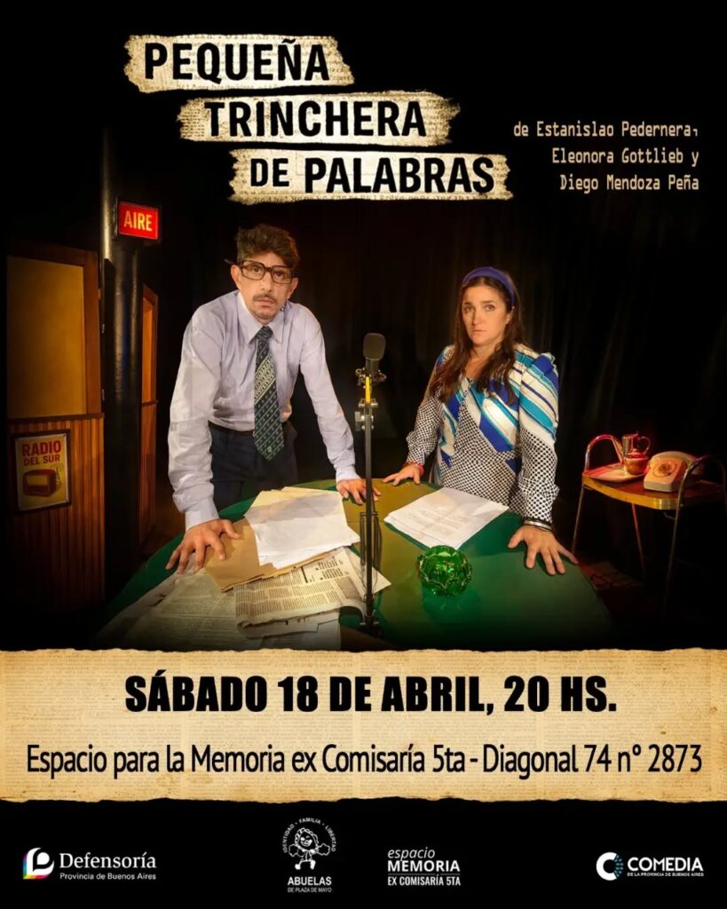 Este sábado 18 de abril, con entradas completamente agotadas, se realizará una función abierta de “Pequeña trinchera de palabras” en el Auditorio del Espacio para la Memoria ex Comisaría 5ta (Diagonal 74 N°2873, La Plata). La obra, escrita en el marco del 50 aniversario del último Golpe de Estado, forma parte del programa Teatro y Memoria y, según contó Eleonora Gottlieb, “en 24 horas se agotaron todas las entradas”.
