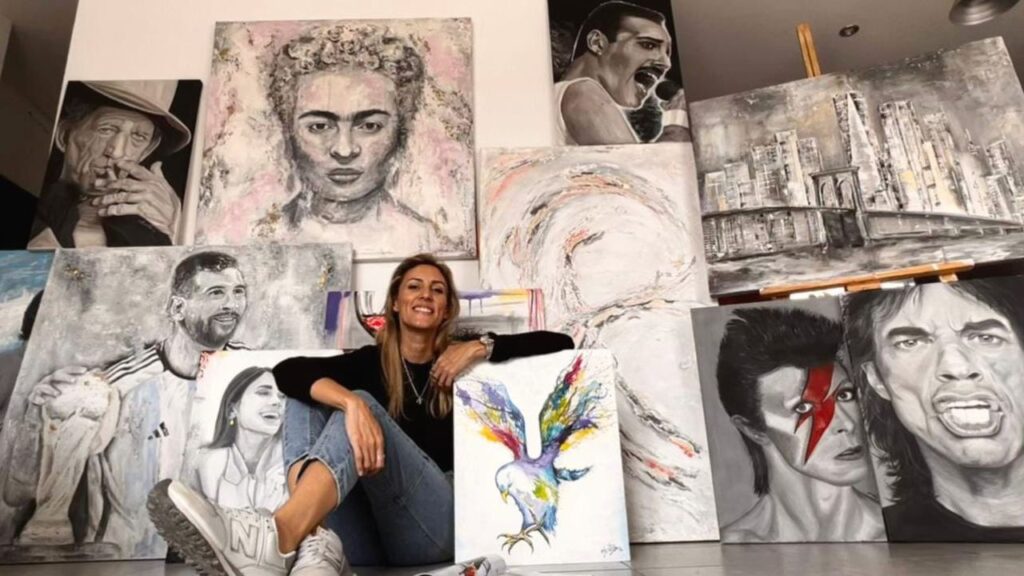 Esa búsqueda personal se traduce en obras donde el retrato ocupa un lugar central. Figuras de la música y del deporte aparecen como punto de partida para composiciones que combinan técnica mixta y una fuerte impronta expresiva. “Trabajo mucho con retratos porque me interesa capturar algo más que la imagen, una energía, una emoción”, señaló. En esa línea, una de sus piezas más representativas es “G1oria”, donde confluyen dos íconos del fútbol argentino, Lionel Messi y Diego Maradona, en un mismo rostro. “Quería unirlos en una sola imagen, ver qué pasaba con ese cruce. Fue algo bastante intuitivo”, recordó.